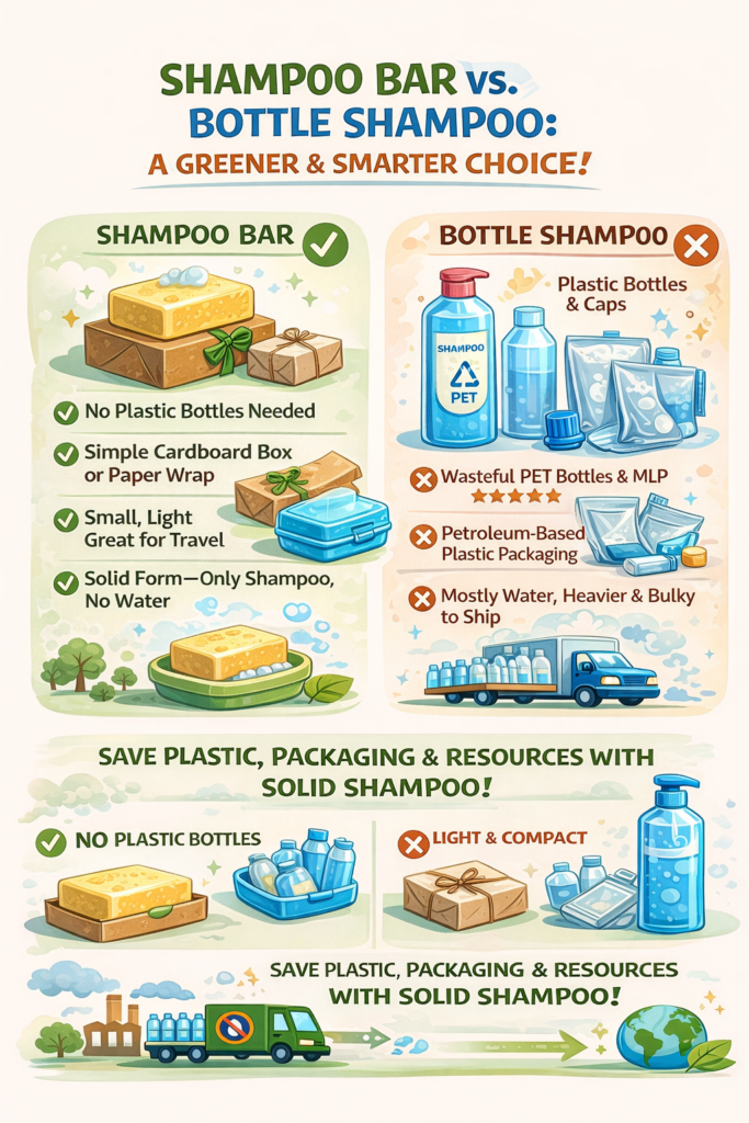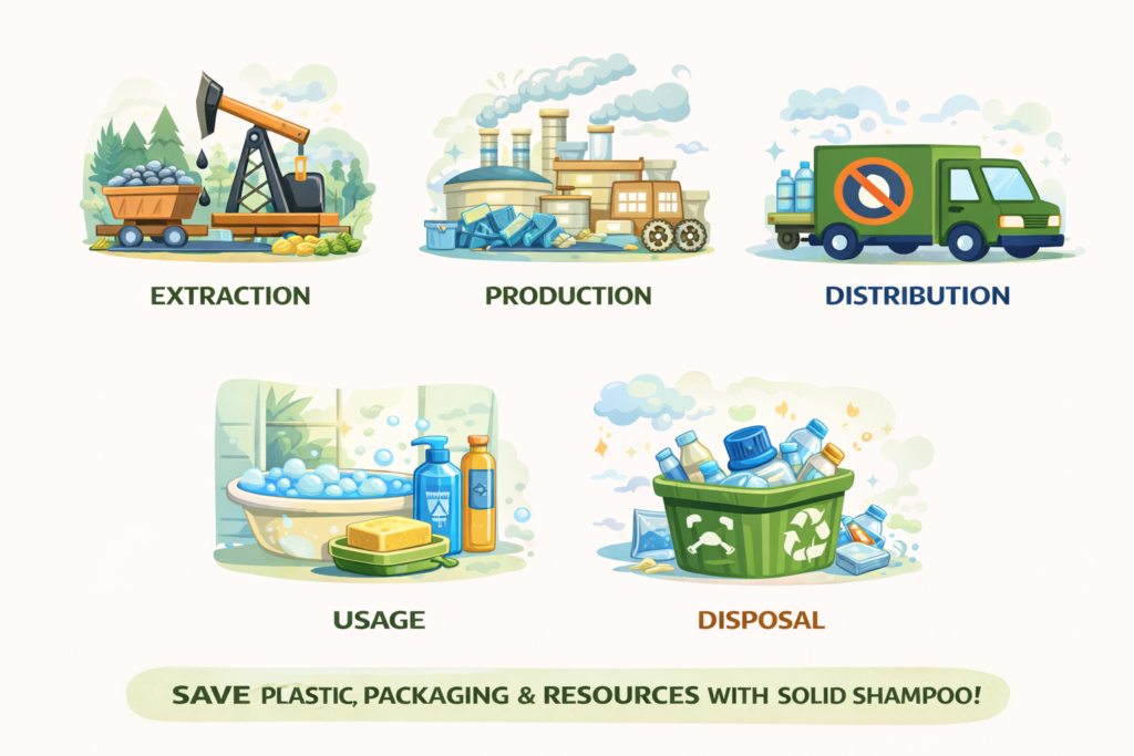 Shampoo bars are replacing liquid shampoo in plastic bottles. Learn how solid shampoo cuts packaging waste, eliminates PET bottles, reduces transport emissions, and saves resources by removing water from the product.
